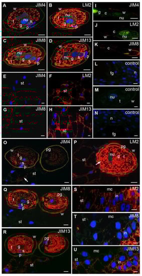 In the nucellus, only the fluorescence derived from both JIM8 (Figure 3G) and JIM13 (Figure 3H) Abs was observed. In epidermis and subepidermis cells, the signal was localized in the apoplast. The signal was also localized in the cytoplasm in the cells situated deeper. In this stage, no labeling by JIM4 (Figure 3E) or LM2 (Figure 3F) Abs was detected in nucellus surface cells.