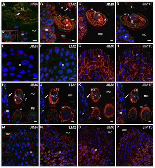 Immunolocalization of AGPs in larch pollinated ovules. (A–H) The pollen in the micropylar canal. (A–D) Micropylar canal: The epitopes recognized by JIM4 Abs occurred in the material that formed as a result of the degeneration of the stigmatic tip cells, while labeling was not observed in the integument (A), the fluorescent signal of JIM4 Abs in pollen grain was also visible (A’), LM2 Abs—the signal was present in the cytoplasm and the pollen wall and stigmatic tip cells (arrow), the fluorescence was present mainly in integument cell cytoplasm, the region of pollen grain adhesion and the apoplast (B), JIM8 (C) and JIM13 (D) Abs—labeling was present in the pollen grain and in the integument cells away from the region of the pollen adhesion; (E–H) Nucellus: cells were completely devoid of the fluorescence from JIM4 (E) and LM2 (F) Abs, only JIM8 (G) and JM13 (H) Abs were observed; (I–P) pollen grain in the micropylar canal. All studied AGPs occurred in the cytoplasm of the pollen grain—JIM4 (I), LM2 (J), JIM8 (K), JIM13 (L), only LM2 Abs was visible in the pollen wall (J), small clusters of signal from examined Abs were also present in the surface of the micropylar canal (J, arrow), only JIM13 Abs labeling was localized in the subepidermal cells in the integument (L); (M–P) Nucellus: JIM4 Abs labeling was not visible (M), LM2 (N), JIM8 (O) and JIM13 (P) Abs were widely localized in the ecm in the apical region of the nucellus and the central area of this tissue in the cytoplasm. g generative cell, t tube cell, s sterile cell, p prothallial cell, w pollen wall, pg pollen grain, st stigmatic tip, mc micropylar canal, n nucellus, in integument, nu nucleus. red—signal of the immocytochemical reaction, blue—DAPI staining, green—autofluorescence. Bars 10 µm.