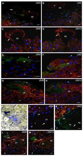 In nucellus cells surrounding the growing pollen tube, only single spots of fluorescence from JIM4 Abs (Figure 4E) were observed in contrast to the LM2 (Figure 4F), JIM8 (Figure 4G) and JIM13 Abs (Figure 4H), in which increased signal was noted in the cytoplasm and apoplast. At this time, the fluorescence intensities of all examined Abs were clearly reduced only in the epidermal cells.