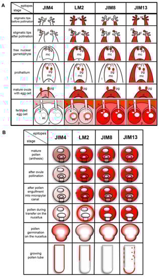 Temporal and spatial changes in the distribution of the different categories of AGPs during male gametophyte–ovule interaction in L. decidua are summarized in Figure 5.