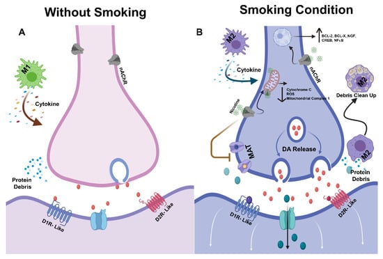 4.1. Nicotine-Induced Changes in the Microenvironment of DAergic Neurons