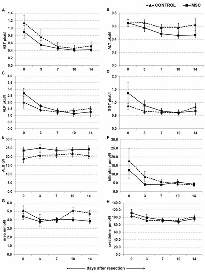 2.4. Portal Vein Transplantation of MSC Did Not Affect Biochemical Parameters in a Porcine Model of Biliary Obstruction