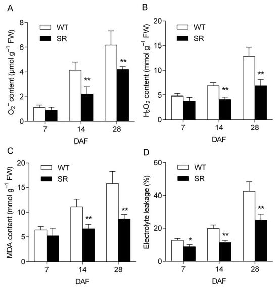 2.5. Reduced ROS Accumulation and Oxidative Damage in the Leaves of Rice SR during Natural Senescence