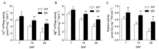 2.6. Elevated Activities of Ca2+-ATPase, Mg2+-ATPase, and Rubisco in Rice SR during Natural Senescence