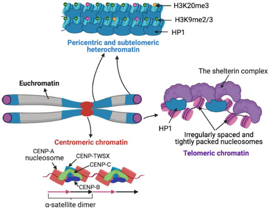 Satellite chromatin organization. In contrast to euchromatin, pericentric and subtelomeric regions are compact, marked by repressive modifications such as H3K9me3 and H3K20me3 and bound by Heterochromatin-associated Protein 1 (HP1). At centromeres, Centromere Protein A (CENP-A) nucleosomes form tight complexes with DNA binding centromeric proteins CENP-B, CENP-C and the histone-fold containing protein complex CENP-TWSX. Telomeric ends contain irregularly spaced and tightly packed nucleosomes separated by 10-20 bp DNA linkers. Telomeric chromatin is tightly associated with the shelterin complex and HP1.