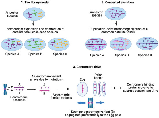 Satellite evolution. The library model can account for the divergent evolution of species-specific satellite families through independent expansion and contraction of satellite families in diverging species. Concerted evolution occurs via recombinational processes that result in expansions, contractions and homogenizations of tandemly repetitive sequences. Centromere drive is a selfish process in which stronger centromeres preferentially orient towards the egg pole during asymmetric female meiosis. Drive is suppressed when mutation of a centromere-binding protein restores centromere balance, resulting in an arms race between centromeric satellite DNA and centromere proteins.
