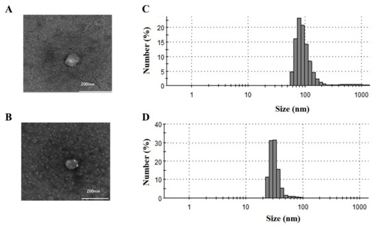 The EVs isolated from human serum by UC and multiple-cycle polymeric EV precipitation were characterized by TEM and a Zetasizer Nano ZS. The TEM and Zetasizer analyses were applied to confirm the size distribution and morphology of the isolated EVs (Figure 1). The average sizes of the UC and four-cycle EV fractions were 114 nm (50–160 nm) and 40 nm (25–80 nm), respectively. The four-cycle EV fractions were a little smaller than the UC fractions.
