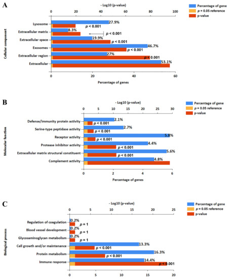 A total of 612 proteins (unique peptides ≥2) was identified in the four-cycle EV fractions from human serum by shotgun proteomic analysis. Of them, 539 proteins (89%) were included in the EVpedia depository (http://evpedia.info, accessed on 18 May 2019), a public database for extracellular vesicle research. These proteins were highly enriched in extracellular exosomes, extracellular vesicles, and extracellular regions by functional enrichment analysis using FunRich version 3.1.3 (Figure 2). We could not prepare enough EVs fractions from UC experiments due to the limitations due to sample volume and very low recovery rate. Therefore, our current data were compared with the proteome profile from another investigation using multiple-cycle UC [21]. In brief, Kim et al. reported that 478 proteins including a single unique peptide were identified in LC-MS/MS analysis of EV proteins enriched from 4 mL of serum using five cycles of UC. Among these proteins, we extracted 273 having two or more unique peptides to compare with our identified proteins.