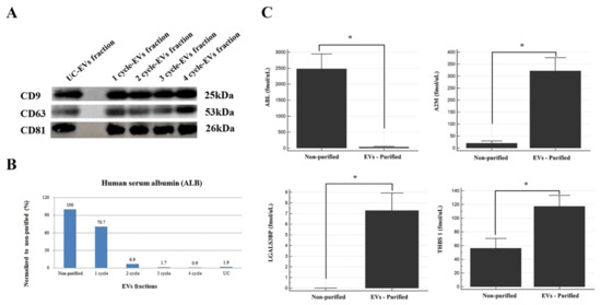 The purity evaluation. (A) Western blot analysis of CD9, CD63, and CD81 on 1–4-cycle EV fractions. (B) The ALB levels measured in EV fractions (1–4 cycles) and UC using an MRM assay. (C) The levels of 3 EV markers (A2M, LGALS3BP, and THBS 1) and ALB in non-purified and EV-purified fractions (2-cycle) obtained by an MRM assay. *, p-value < 0.0001.