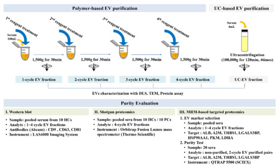 This study was approved by the Institutional Review Board (IRB) of Samsung Medical Center (Seoul, Korea) (IRB file No. 2008-06-007-026). We recruited 10 healthy controls (HC) and 10 patients with pancreatic cancer (PC) for EV purity assessment and LC-MS/MS EV fraction experiments. All serum specimens were obtained by centrifugation of blood at 2330× g for 5 min and stored at −70 °C for further analysis.