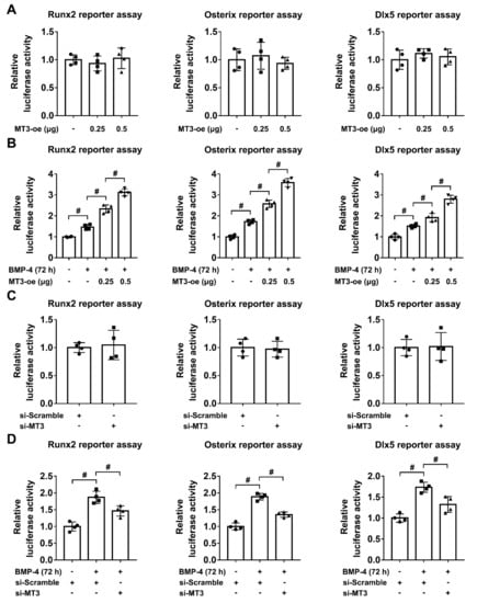 MT3 indirectly regulates Runx2/Osterix/Dlx5 activation during osteoblast differentiation. (A) Luciferase reporter activities of Runx2, Osterix, and Dlx5 in control or MT3-overexpressing 293T cells. (B) Luciferase reporter activities of Runx2, Osterix, and Dlx5 in control or MT3-overexpressing C2C12 cells treated with or without recombinant BMP4 for 72 h. (C) Luciferase reporter activities of Runx2, Osterix, and Dlx5 in control or MT3 knockdown 293T cells. (D) Luciferase reporter activities of Runx2, Osterix, and Dlx5 in control or MT3 knockdown C2C12 cells treated with or without recombinant BMP4 for 72 h. All data are presented as mean ± SEM, # p < 0.05.
