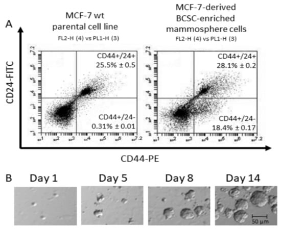 It was reported that CD44+/CD24– breast cancer cell fraction is enriched with cells with stem-cell-like properties (BCSCs) []. The mammosphere growth assay is a method to enrich and propagate CD44+/CD24- BCSCs in three-dimensional (3D) culture, as described previously [,,]. Following this technique, MCF-7 cells were grown as mammospheres in serum-free medium containing 10 ng/mL basic fibroblast proliferation factor, 20 ng/mL epidermal growth factor (EGF), and 2% B-27 to induce the mammosphere formation for 14 days [,]. Mammospheres were enriched in cells with the CD44+/CD24+ marker profile, reaching nearly 20% (Figure 1), as verified by flow cytometry as described previously [,]. Mammospheres images were captured and counted using an IX71 microscope at ×400 (Olympus, Notting Hill, VIC, Australia).