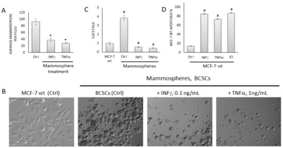 Biological effects of TNFα on parental MCF-7 cells and MCF-7-derived, BCSC-enriched mammospheres. (A). TNFα and INFγ treatments led to significant reduction in mammosphere growth. Representative images are shown (×20); experiments were repeated at least 4 times with similar results. (B). MCF-7 cells (Ctrl; controls) are shown as an example of parental cells line phenotype. Mammospheres were treated with TNFα and INFγ and photographed. Representative images are shown. (C) Rt-PCR analysis of S1P3 expression in parental and MCF-7-derived mammospheres. The level of housekeeping gene β-actin was used to estimate fold change in S1P3 expression. (D) INFγ (0.1 ng/mL), TNFα (1 ng/mL), and ICI182780 (ICI; 10 nM) stimulated apoptosis in MCF-7 wild-type (parental) cells after 72 h treatment. Flow cytometry was used to estimate apoptosis % of PI and Annexin V positive cells. * p-value < 0.05; # p-value < 0.01.