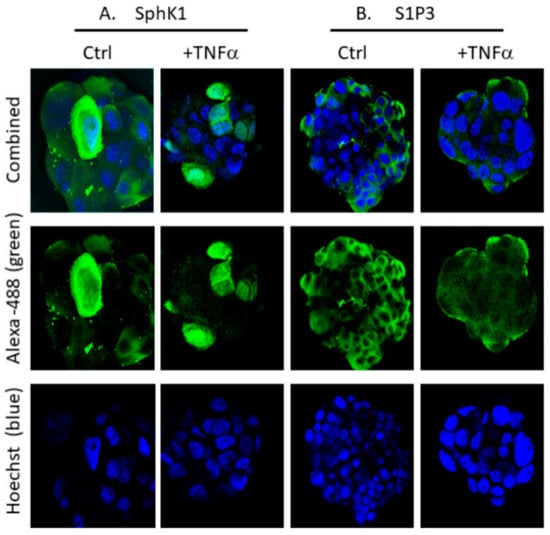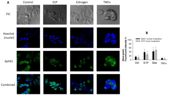 To identify potential differences in sphingolipid signaling between BCSC-enriched and parental MCF-7 cells, we first visualized the localization of SphK1 and S1P3 in parental MCF-7 cells using IF with commercially available antibodies and confocal microscopy as described previously [,]. SphK1 was localized in the cytoplasm of parental vehicle-treated (control) cells (Figure 3A,B). Some heterogeneity of the enzyme expression level was apparent and might be associated with different stages of cell growth and division. The pattern of SphK1 localization was altered after treatment of cells with the SphK1-activating estrogen and with the receptor agonist S1P. Specifically, perinuclear and nuclear localization of SphK1 (observed as the overlap of Hoechst stain with Alexa-488-labelled endogenous SphK1 immunofluorescence) was detected in a subpopulation of cells after treatment with estrogen or S1P for 3 h (Figure 3). Although S1P promoted SphK1 nuclear localization, TNFα, which is known to stimulate the production of S1P, did not induce SphK1 nuclear translocation []. Instead, TNFα treatment induced MCF-7 cell rounding, anoikis, and membrane blebbing consistent with the activation of apoptosis by this pro-inflammatory cytokine. While the nuclear localization of SphK1 in TNFα-treated cells was not observed, the presence of the enzyme in proximity to the plasma membrane and in cytosol was detected. Analysis of co-localization of both Alexa-488 (green)-labelled SphK1 and S1P3 and Hoechst (blue nuclei) is shown in Figure 3B.