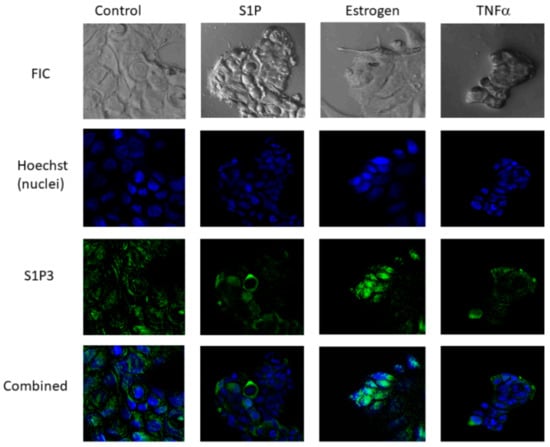 Sphingosine-1-phosphate (S1P) was purchased from Biomol Research Laboratories Inc. (Plymouth Meeting, PA, USA). S1P was dissolved in 10 mM NaOH at 3 mM as described previously [,,]. Estrogen (17β-estradiol) and TNFα were bought from Merck (Bayswater, VIC, Australia). The human breast cancer cells MCF-7 cells were purchased from ATCC® (Manassas, VA, USA) and cultured in phenol red-free Dulbecco’s modified Eagle’s medium (CSL Biosciences, Parkville, Australia) supplemented with 10% fetal bovine serum. Culture medium contained L-glutamine (2 mM), nonessential amino acids, penicillin (100 U/mL), and streptomycin (100 mg/mL) as described [,,].
