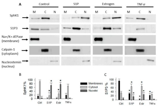 The confocal imaging analysis was confirmed using cell fractionation experiments (Figure 5). Subcellular fractions were characterized using specific subcellular compartment markers. Nucleostemin was used as a marker for the nuclear fraction, Na+/K+-ATPase for the membrane fraction, and calpain-1 for the cytoplasm fraction. Results showed (Figure 5A,B) that SphK1 and S1P3 endogenous proteins are localized to both the membrane and cytosol fractions in control cells. Estrogen and S1P treatments increased S1P3 internalization and the nuclear pool of SphK1 and S1P3 (Figure 5C). In contrast to the effects of estrogen and S1P, TNFα stimulated degradation of S1P3 but did not induce nuclear localization of SphK1 and S1P3. These findings are consistent with the results from imaging analysis.