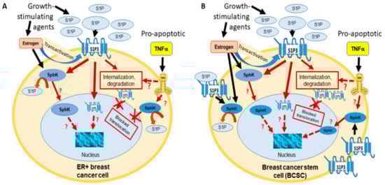 The G-protein-coupled S1P receptor 3 (S1P3) is a membrane-localized protein, although the receptor is quickly internalized after ligand binding []. The internalized S1P3 can either be recycled or degraded in the lysosomes []. Considering the high concentration of S1P in blood plasma (approximately 1 μM), the dynamic transfer of S1P receptors between membrane and cytoplasm is a regular and continuous process. There is also evidence that this process can be stimulated by extracellular signals. For example, S1P3 activation and internalization was detected in response to treatment of MCF-7 cells with estrogen [,,] and the selective estrogen receptor (ER) modulator tamoxifen []. However, the extent to which various growth-stimulating or -inhibiting agents control subcellular localization of SIP-signaling components, and the importance of this process in cancer, remains to be defined. Moreover, there are discrepant reports regarding the intracellular localization of both SphK1 and S1P3 from IHC staining of cancer tissues [,]. It is possible that the heterogeneous findings regarding SphK1 and S1P3 localization in cancer are reflective of underlying cellular heterogeneity. In particular, tumors generally contain a subpopulation of relatively undifferentiated cells with progenitor-like characteristics/markers, an intrinsic self-renewal capacity, and a remarkable resistance to apoptosis: these are termed cancer stem cells (CSC).