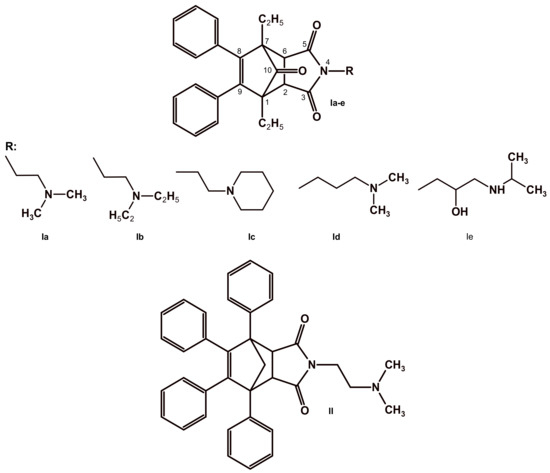 The starting imides 1–3 were obtained in Diels–Alder reactions between appropriate dienes and maleimide, while the compounds 4 and 5 were obtained in the reaction with N-(hydroxyethyl)-maleimide (Scheme 1). The epoxy-derivatives were obtained by condensation of starting imides with epichlorohydrin, and the products were condensed with appropriate amines to give alkanolamine derivatives (Scheme 1). In the reaction between imide 1 and 1,2-dichloroethane, the chloroalkyl derivative was obtained and condensed with an appropriate amine (Scheme 1). All obtained amino-derivatives were converted to their hydrochlorides by using methanol saturated with hydrochloride. The lead compounds with the best activity (Ic, Ie, and II) described previously [9] were converted to their acetates by using boiling acetic acid. The structures of new compounds were established by spectroscopic methods (1H NMR, 13C NMR, and HRMS). In this case, ethyl groups in positions 1 and 7 were replaced by methyl groups.