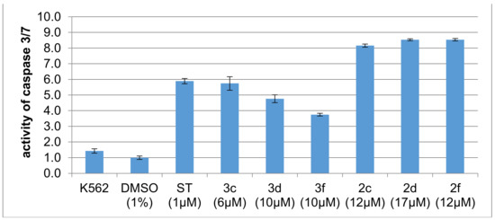 Six derivatives of dicarboximides, i.e., 3c, 3d, 3f, 2c, 2d, and 2f, with the highest cytotoxicity against K562 leukemia cells (IC50 < 6 µM) and with the same alkanolamine fragment in the structure were further evaluated for the ability to induce apoptosis in cancer cells. Caspases 3 and 7 (caspase 3/7) are markers of apoptosis, and their activity was upregulated during this process. K562 cells were treated with 1% DMSO (negative control), 1 μM staurosporine (a strong inducer of apoptosis, a positive control), or a test compound at the concentration of 5xIC50. After incubation for 18 h, K562 cells were lysed and the activity of caspase 3/7 was measured using a profluorescent peptide substrate. Staurosporine strongly activated caspase 3/7 in K562 cells, while DMSO had no effect (Figure 2). We also observed a significant increase in the activity of caspase 3/7 in the presence of all tested dicarboximides. Particularly, derivatives 2c, 2d, and 2f were potent activators of apoptosis, as they induced an over eight-fold increase in caspase activity compared to control. Incubation of cells with compounds 3c, 3d, and 3f activated caspase 3/7 to a lesser extent. Altogether, these data suggest that the cytotoxicity of new derivatives of dicarboximides is most likely due to the induction of apoptosis in the chronic myelogenous leukemia (CML) K562 cells.
