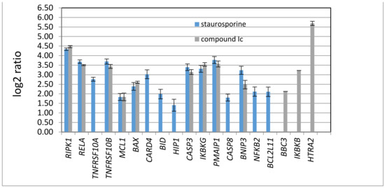Human apoptosis array analysis of gene expression in K562 exposed to compound Ic at 10 µM (5 × IC50) for 18 h. Staurosporine (1 µM) served as a positive control. Only apoptosis-related genes with statistically significant changes in expression are shown (p < 0.05, t-Student). The fold of change was expressed as log2 ratio of gene expression in a test sample vs control sample (cells + DMSO).