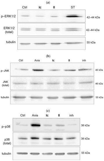 Effect of dicarboximides Ic and II on activation of ERK1/2 (a), JNK (b), and p38 (c) kinases in K562 leukemia cells. Ctrl—control cells treated with 1% DMSO; Anisomycin 20 µM (positive control, activator of JNK and p38 kinases); Ic (6 µM); II (3 µM); ST—Staurosporine 1 µM (positive control, activator of ERK1/2); inh—JNK inhibitor 20 µM or p38 inhibitor 10 µM.