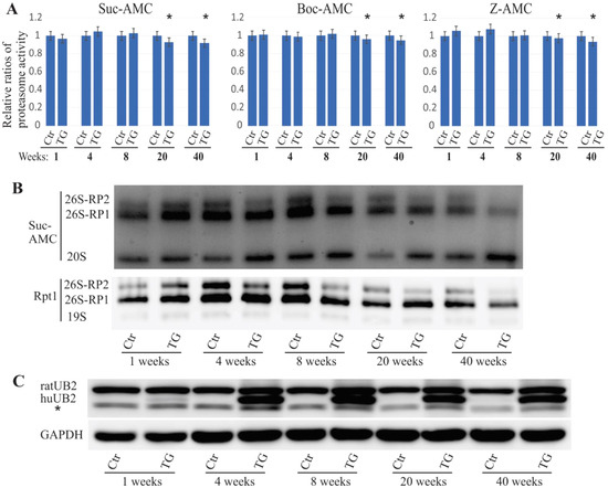We previously reported that an ALS/FTD-linked UBQLN2 mutation led to both neuronal death [6] and the accumulation of proteasome subunit Rpt1 in rats [26]. In these rats, embryonic transgene expression was suppressed using 50 µg/mL doxycycline (DOX) in drinking water, and the DOX was deprived from the drinking water after birth. To study the effect of mutant UBQLN2 on proteasome function, we examined both proteasome activity and assembly in these rats. The overall proteasome activity was measured using proteasome assay buffer with either Boc-LRR-AMC substrate, Suc-LLVY-AMC substrate, or Z-LLE-AMC substrate for trypsin-, chymotrypsin-, or caspase-like proteasome activity, respectively. Based on the protein-lysate samples, we observed that overall frontal-cortex proteasome activity was unaltered until 20 weeks of age, but then worsened to the age of 40 weeks, with identical results obtained for the three different substrates (Figure 1A). These in vivo results indicate that proteasome activity was impaired during the late stages of the disease caused by mutant UBQLN2 expression in rats. Proteasome integrity was assessed using in-gel assay with the Suc-AMC substrate, followed by immunoblot assessment using the Rpt1 antibody. We found that 26S proteasomes that included a single regulatory subunit (26S-RP1) and two regulatory subunits (26S-RP2) were decreased in mutant UBQLN2 rats as early as four weeks of age and further deteriorated with age (Figure 1B,C). As previously described, mutant UBQLN2 has been shown to cause neurodegeneration in rats by 18 weeks of age. The present findings suggest that proteasome impairment precedes neuronal loss in mutant UBQLN2 rats.