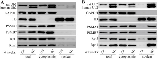 Altered proteasome subunit expression in mutant UBQLN2 rats. Cell fractionation revealed the expressions of proteasome subunits. Rat forebrains were dissected from mutant UBQLN2 transgenic (TG) and non-transgenic (Ctr) rats and tissue lysates were fractionated into nuclear and cytoplasmic components. The nucleus marker (histone 3: H3) and the cytoplasmic marker (GAPDH) were used to determine fractionation effectiveness. Human UBQLN2 and rat Ubqln2 (Ub2) were detected as two separate bands. The proteasome subunits PSMA1, PSMB7, Rpt1, and Rpn1 were examined in 4-week-old rats (A) and in 40-week-old rats (B).
