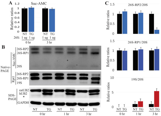 Several in vitro and in vivo reports have implicated mutant UBQLN2 in impaired proteasome functions [4,10,16,26]. In the present UBQLN2 transgenic rats, 26S proteasome integrity was impaired as early as four weeks of age (Figure 1). To examine whether the mutant UBQLN2 was responsible for proteasome dissociation, we incubated 4 µg of purified 26S proteasome with 30 µg of native protein lysate from 4-week-old rats at 37 °C for different amounts of time. We then assessed proteasome activity in these samples using the Suc-AMC substrate, and observed that the overall proteasome activity was unchanged (Figure 5A). However, the in-gel assay revealed that proteasome 26S-RP2 (containing two regulatory particles) decreased dramatically after three hours of incubation. Similar results were obtained by immunoblot analysis using the Rpt1 antibody, which showed that 19S was slightly elevated at the one-hour incubation time point but significantly elevated greatly at the three-hour time point (Figure 5B,C). These results were consistent with our previous finding that impairment of proteasome assembly occurred prior to compromised proteasome activity (Figure 1), and suggest that the ALS/FTD-linked UBQLN2 mutation dissociates 26S proteasome into 20S and 19S particles.