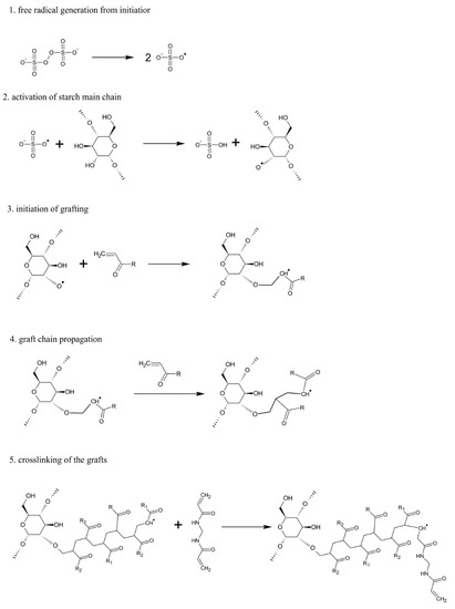 There has been a lot of research on the chemical modification and cross-linking of cellulose. However, starch modification was also tested with various synthetic monomers, e.g., acrylic acid [9,10,11,12,13,14,15], acrylamide [16,17,18], methacrylamide [19,20], acrylonitrile [21], vinyl alcohol [22], 2-acrylamido-2-methylpropanesulfonic acid [23,24], styrene [25], vinylimidazole [26].
