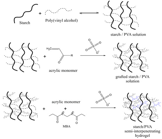 A three-necked round-bottom flask 250 mL was filled with 3.020 g of potato starch, 18 mL of distilled water and 0.9 mL, of 40 wt% NaOH solution. The flask was placed in a water bath at the temperature of 40 °C under a nitrogen atmosphere and stirred with a mechanical stirrer. When the starch was gelatinized, to the mixture was added: 10 mL of 2.817 g/mol AM solution and 17.992 g AA neutralized with NaOH solution. After 30 min, the temperature was raised to 50 °C and 0.015 g of KPS was added as initiator and 15 min later 20 mL of PVA aqueous solution (2006 g PVA) was added. The mixture was stirred for 30 min and a solution of crosslinking agent (0.068 g/mol MBA) was introduced. Afterwards the mixture turned into a thick gel and was stirred for 4 h using a mechanical stirrer. The obtained product was removed from the flask and cut into pieces 5 × 5 mm. The pieces were dried for 120 h at ambient temperature, and then transferred to a vacuum oven at 50 °C for 24 h. After drying, it was ground into small pieces in an IKA A-10 basic laboratory mill. The mechanism of semi-interpenetrating network hydrogel formation according to this synthesis is schematically depicted in Figure 3.
