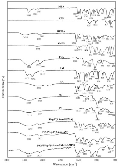 FTIR spectra of AMPS, PVA, AA, MBA KPS, PS, AM, PVA/PS-g-P(AA-co-AM-co-AMPS), PVA/PS-g-P(AA-co-AM) and SS-g-P(AA-co-HEMA).