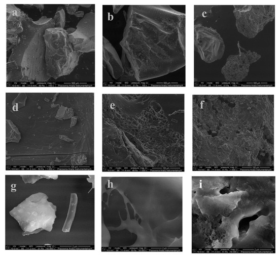 SEM images at 150× magnification of substances: (a) PVA/PS-g-P(AA-co-AM-co-AMPS), (b) PVA/PS-g-P(AA-co-AM), (c) SS-g-P(AA-co-HEMA), 1000× magnification of substances (d) PVA/PS-g-P(AA-co-AM-co-AMPS), (e) PVA/PS-g-P(AA-co-AM), (f) SS-g-P(AA-co-HEMA), 50,000× magnification of substances (g) PVA/PS-g-P(AA-co-AM-co-AMPS), (h) PVA/PS-g-P(AA-co-AM), (i) SS-g-P(AA-co-HEMA).