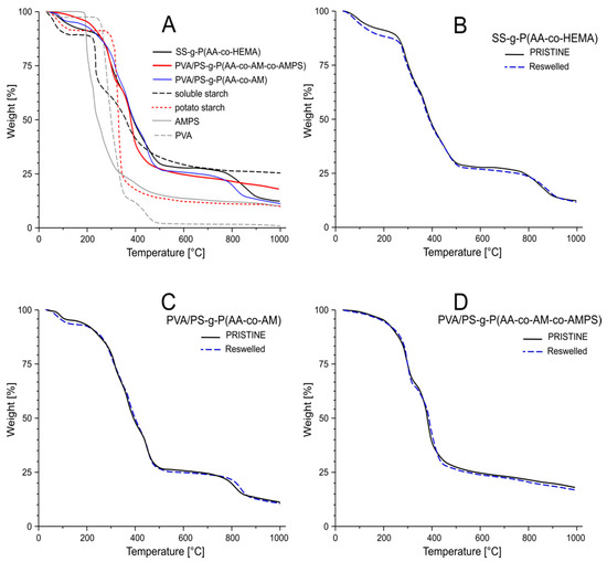 TG curves of studied substances superabsorbent polymers SS-g-P(AA-co-HEMA), PVA/PS-g-P(AA-co-AM-co-AMPS), PVA/PS-g-P(AA-co-AM) and selected starting compounds soluble starch, potato starch, AMPS and PVA (A). Comparison of polymer TG curves before swelling and after 10 swelling/drying cycles for SS-g-P(AA-co-HEMA) (B), PVA/PS-g-P(AA-co-AM) (C) and PVA/PS-g-P(AA-co-AM-co-AMPS) (D).
