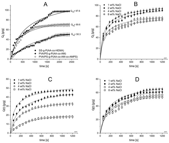 When developing materials for potential applications in hygienic products, the absorption of different concentrations of salt solutions is a very important parameter. In this section the superabsorbent polymers’ absorbency of NaClaq solutions of 1 wt%, 2 wt%, 4 wt% and 8 wt% were analyzed. The properties of the external solution, such as charge valence and salt solution concentration, have a great influence on the swelling of superabsorbent polymers [68]. Figure 8A,B show the results of the liquid absorption and it can be seen that the equilibrium absorption of the salt by the superabsorbent polymers in the NaClaq solution clearly decreases with increasing concentration. The shrinkage of the products is largely due to the fact that with an increase in the concentration of the external salt solution, the difference in osmotic pressures decreases, and the influence of the penetrating Na+ counterions on the anionic groups (COO−, SO3−) weakens the anion–anion repulsion between the carboxylate groups, thus reducing the swelling capacity [69]. The highest absorption values of the NaClaq solution were recorded for SS-g-P(AA-co-HEMA) reaching Qeq of 93.3 (see Table 3) in 1 wt% NaClaq solution. For all three polymers the sorption of the NaClaq solution is lower than the sorption of pure water, and it decreases with the salt concentration. This is clearly seen from the graphs in Figure 7B–D, where the swelling dynamics is plotted for each polymer in every NaCl concentration. Additionally, in Table 3 the numerical parameters of the swelling curves and the experimental estimation of Qeq are shown.