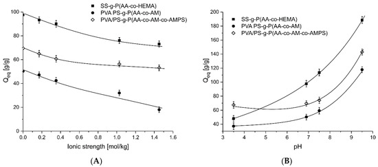 Based on the obtained results, presented in Figure 8A,B, we can observe the increasing equilibrium swelling with higher pH. Moreover, it is evident that at lower pH (below 7) the influence is weak, while in the alkalic region Qeq steeply raises. This can easily be attributed to influence of pH on the dissociation of ionic groups. When the pKa for a given ionic group is higher than the pH of the solution, the group is associated and does not contribute largely in the water uptake process [40]. In all the polymers the carboxylic group are present in large amounts and their attribution is significant at higher pH. However, there are also –SO3H groups present in AMPS counterparts of PVA/PS-g-P(AA-co-AM-co-AMPS) and they are responsible for higher water absorption compared to PVA/PS-g-P(AA-co-AM). Additionally, the acidic environment causes the stiffening of the polymer chains and as a result, of the protonation of sulfonic and carboxylic anions and the formation of hydrogen bonds between carboxylic carbonyl oxygen and the amide group of the acrylamide moieties, which causes the superabsorbent to contract. The anion-anion interaction (repulsion) increased the absorption properties (increased space between the chains) and the degree of ionization of the –COOH and –SO3H groups with the increase in the acidity of the solution [66]. The increase in anion density itself improves the absorption properties of the material, which results in an increase in the hydrophilicity of the superabsorbent polymers, facilitating the diffusion of the solution into the molecule [67].