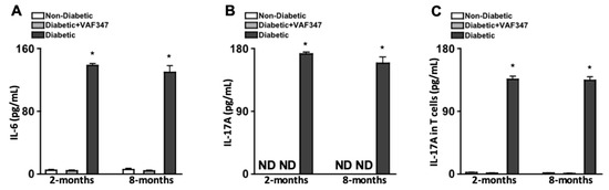 To ascertain if the VAF347 therapeutic regimen was sufficient to ameliorate diabetes-mediated Th17 cell differentiation, spleens were collected from non-diabetic, diabetic, and VAF347-treated diabetic mice two and eight months after diabetes was confirmed (n = 3/group per time point), CD4+ T cells were isolated by negative selection columns, and the levels of IL-17A in T cell lysates was quantified by ELISA analysis. As shown in Figure 1C, no IL-17A was detected in the T cells of non-diabetic mice (white), yet ~150 pg/mL of IL-17A was detected in the untreated diabetic (black) which was ameliorated to undetectable levels of IL-17A in the T cells of the diabetic mice treated with VAF347 (grey). Taken together, these results suggest the VAF347 treatment regimen is sufficient to halt diabetes-mediated IL-17A and Th17 cell differentiation.