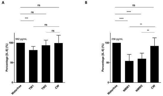 Secretion of the pro-inflammatory cytokine IL-8 by T84 cells after stimulation with an LF82 bacterial lysate (A) or exposure to H2O2 (B) in the presence of 50 µL of different waters (distilled water or NMW1 or NMW2). The results are presented as the mean ± SEM of at least five independent experiments. Statistical comparisons were carried out by one-way ANOVA with the Bonferroni post hoc test (** p < 0.01, *** p < 0.001, **** p < 0.0001, ns—not significant) after normality testing using the Kolmogorov–Smirnov test.
