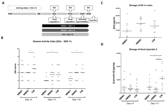 Effect of the administration of NMW1 or NMW2 on a DSS-induced inflammation model. (A) Experimental protocol. (B) Evaluation of the disease activity index (DAI) on days 4, 11, and 18. (C) Production of the proinflammatory cytokine KC by the colonic mucosa. (D) Determination of fecal lipocalin-2 levels. The results are presented as the median. Statistical comparisons were carried out after normality testing using Kolmogorov–Smirnov tests, and subsequent one-way ANOVA with the Bonferroni post hoc test was performed (* p < 0.05, ** p < 0.01).