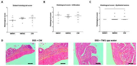 Effect of the administration of NMW1 or NMW2 on histological lesions. (A) Global histological score. (B) Infiltration of immune cells into the colonic mucosa. (C) Evaluation of epithelial lesions in the colonic mucosa. (D) HES staining of the colonic mucosa showing epithelial lesions (bar represents 50 µm). The results are presented as the median. Statistical comparisons were carried out after normality testing using Kolmogorov–Smirnov tests, and subsequent one-way ANOVA with the Bonferroni post hoc test was performed (* p < 0.05).