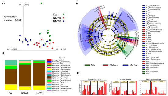 Analysis of the composition of the microbiota associated with the colonic mucosa of mice treated with DSS that received or did not receive NMW1 or NMW2. (A) Analysis of beta diversity. (B) Comparison of the microbiota at the phylum level. (C) Differential analysis of the comparison of the microbiota (LEfSe) between the three conditions. (D) Variations in the abundances of different species between the three conditions.