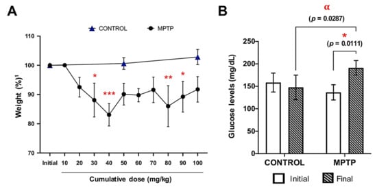 2.2. Increase in Glucose Levels Induced by MPTP Administration