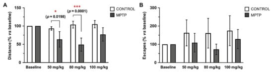 - Open field test. The open field test is one of the most common locomotor tests for experimental PD because rodents with motor deficits or cognitive decline can show an impaired ability to move and explore the arena [64]. The chamber consisted of a transparent open Plexiglas arena (44.5 cm wide × 44.5 cm long × 40 cm high) located inside a system of two sets of 16 infrared photocells (SAI Electronics & Engineering division, University of Murcia, Murcia, Spain). Horizontal locomotor activity and vertical movements were measured by the registration of the beam breaks, which were recorded and transmitted to a computerized system [65]. Every animal was placed in the center of the arena, and its activity was recorded during 180 s. The chamber was cleaned with 70% ethanol after each trial. The test was done taking the following MPTP injections as a time reference: baseline (prior to the first MPTP injection), 48 h after the fifth MPTP injection (cumulative dose of 50 mg/kg), the eighth MPTP injection (cumulative dose of 80 mg/kg) and the last MPTP injection (cumulative dose of 100 mg/kg). Control animals performed the test the same days in order to have comparable measures.