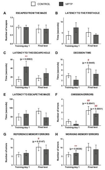 - Barnes Maze. This cognitive test is performed in a Plexiglass circular platform (160 cm diameter) that contains 18 holes: 17 of them are blocked with a mesh, and one is the exit of the maze to the animal’s cage. The test consists of three phases: (i) the habituation day (day 0), in which the animal is kindly taught by the investigator which is the path to escape the maze from the center of the platform; (ii) the training days (days 1–7), in which the animal is placed in the center of the platform and has 4 min to escape the maze (this is repeated for 4 rounds); and (iii) the retention day (“final test”, day 8) that follows the same protocol as the training days. During the training and the retention days, we measured several parameters to evaluate spatial memory. For a detailed description of the protocol, see [66]. Barnes Maze was performed before the last MPTP injection.