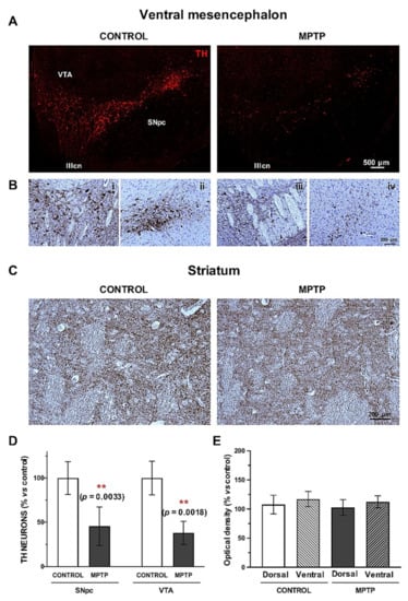 - Annese, V.; Barcia, C.; Ros-Bernal, F.; Gómez, A.; Ros, C.M.; De Pablos, V.; Fernández-Villalba, E.; De Stefano, M.E.; Herrero, M.-T. Evidence of oligodendrogliosis in 1-methyl-4-phenyl-1,2,3,6-tetrahydropyridine (MPTP)-induced Parkinsonism. Neuropathol. Appl. Neurobiol. 2013, 39, 132–143. [Google Scholar] [CrossRef] [PubMed]