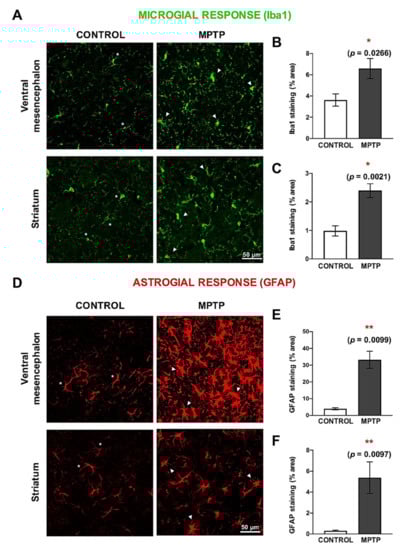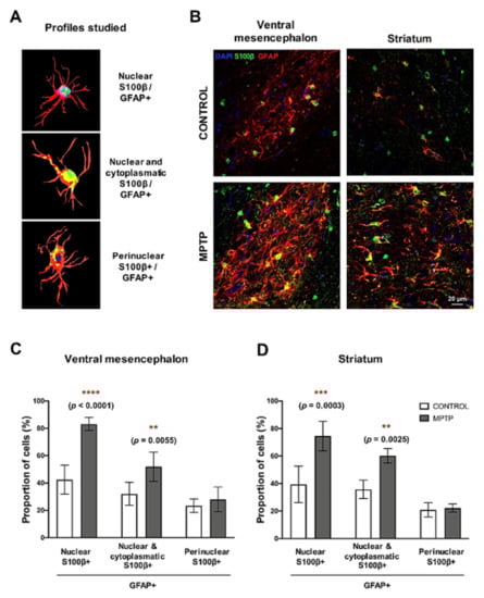 - Muramatsu, Y.; Kurosaki, R.; Watanabe, H.; Michimata, M.; Matsubara, M.; Imai, Y.; Araki, T. Expression of S-100 protein is related to neuronal damage in MPTP-treated mice. Glia 2003, 42, 307–313. [Google Scholar] [CrossRef] [PubMed]