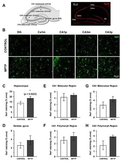 - Singh, S.; Mishra, A.; Tiwari, V.; Shukla, S. Enhanced neuroinflammation and oxidative stress are associated with altered hippocampal neurogenesis in 1-methyl-4-phenyl-1,2,3,6-tetrahydropyridine treated mice. Behav. Pharmacol. 2019, 30, 688–698. [Google Scholar] [CrossRef] [PubMed]