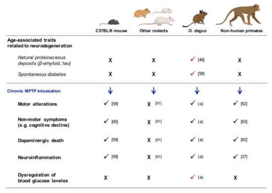 - Bourdenx, M.; Dovero, S.; Thiolat, M.-L.; Bezard, E.; Dehay, B. Lack of spontaneous age-related brain pathology in Octodon degus: A reappraisal of the model. Sci. Rep. 2017, 7, 1–11. [Google Scholar] [CrossRef]