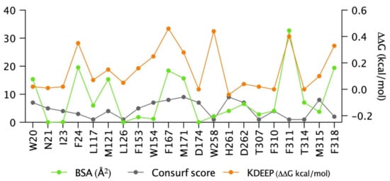We analyzed the resveratrol binding site of the VvROMT model with three in silico tools to obtain information about binding residues and their conservation pattern (Figure 3). The buried surface area (BSA) was calculated with our software tool dr_sasa []. The hydrophobic residues W20 (15.4 Å2), F24 (19.6 Å2), M121 (15.4 Å2), F167 (18.5 Å2), M171 (15.7 Å2), F311 (32.7 Å2), and F318 (19.4 Å2) had the highest contact surface area with resveratrol. To evaluate the impact of single-alanine mutations on the ligand-binding energy (ΔΔG, kcal/mol), we constructed 21 in silico alanine variants, calculated the binding free energy with the KDEEP server [], and compared these energies to the wildtype enzyme. Alanine variants with the highest ΔΔG among the evaluated binding residues corresponded to F167 (0.46 kcal/mol), M171 (0.28 kcal/mol), F311 (0.4 kcal/mol), and F318 (0.33 kcal/mol) (Figure 3). The ConSurf [] server was used to calculate a conservation score based on the VvROMT model and the multiple sequence alignment previously constructed for the phylogenetic analysis. Most of the residues in contact with SAM (W154, F167, M171, and D262) were highly conserved (score ≥ 7) except for W258. We selected the residues F24, F311, and F318 as hotspots, considering their high BSA, the ligand-binding affinity change (ΔΔG), and low conservation score. We further included W20 based on its high BSA value and its possible structural role in the substrate-binding site formation.