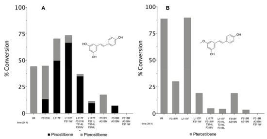 In the variant F311W, an inverted substrate preference was observed (Figure 5A, Table 2), with a 35-fold decrease in the specific activity with pinostilbene (0.91 nmol min−1mg−1) compared with the wildtype enzyme. The substrate preference inversion was even more evident in the F311W/L117F variant, where its activity for pinostilbene considerably decreased, and it was not possible to detect the di-methylated product after 1 hour of reaction, consistent with only a 19% conversion to pterostilbene after 24 h (Figure 5B).