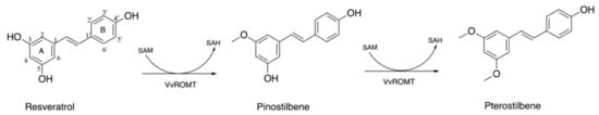 Representation of the VvROMT sequential di-methylation reaction. VvROMT catalyzes the sequential di-methylation at the 3/5-OH position on resveratrol to yield pterostilbene, mediated by the transfer of two methyl group from the co-substrate S-adenosylmethionine (SAM).